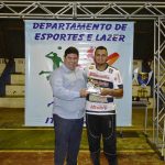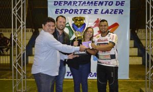 Vereador Edilson, vice-prefeito Mano, e secretária Valdirene entregam troféu de campeão ao atleta da Criativa/BM Metal. Foto: Raiany Cristina
