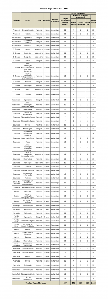 A Universidade Estadual de Mato Grosso do Sul (UEMS) vai ofertar 1.142 vagas em 58 cursos de graduação para a seleção no Sistema de Seleção Unificada (SiSU) 2022. As inscrições no Sisu serão efetuadas exclusivamente pela internet, no período de 15 de fevereiro de 2022 até as 23 horas e 59 minutos do 18 de fevereiro de 2022 (horário de Brasília-DF), no endereço eletrônico http://sisu.mec.gov.br .