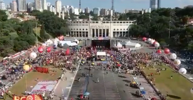 Na Praça Charles Miller, em frente ao Estádio do Pacaembu, centrais como CUT e Força Sindical promoveram ato do Dia do Trabalhador, contando com a presença de Luís Inácio Lula da Silva. Mesmo com a aparição do pré-candidato à Presidência do Partidos dos Trabalhadores (PT), a adesão foi baixa, como evidencia a gravação da Polícia Militar, às 16h12 — na faixa de horário em que o petista discursou.