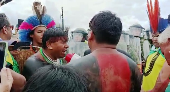 Ainda foi possível ouvir os manifestantes chamarem o ministro Alexandre de Moraes, do STF, de “ditador”. Outras pessoas também se juntaram ao grupo de indígenas. A tropa de choque esteve presente, mas deixou o local pouco tempo depois. No ato, a tropa foi aplaudida pelos manifestantes.