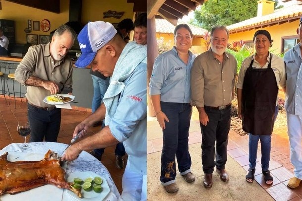 Caseiro na propriedade há 18 anos, Ricardo Vieira Dias não teve como não reparar no prato farto de Cauã. “Pensa no pratão! Ali o bichinho come!”. Nas fotos enviadas por ele, o ator aparece ao fundo e, à frente, está Tony Ramos pegando um pedaço do assado.