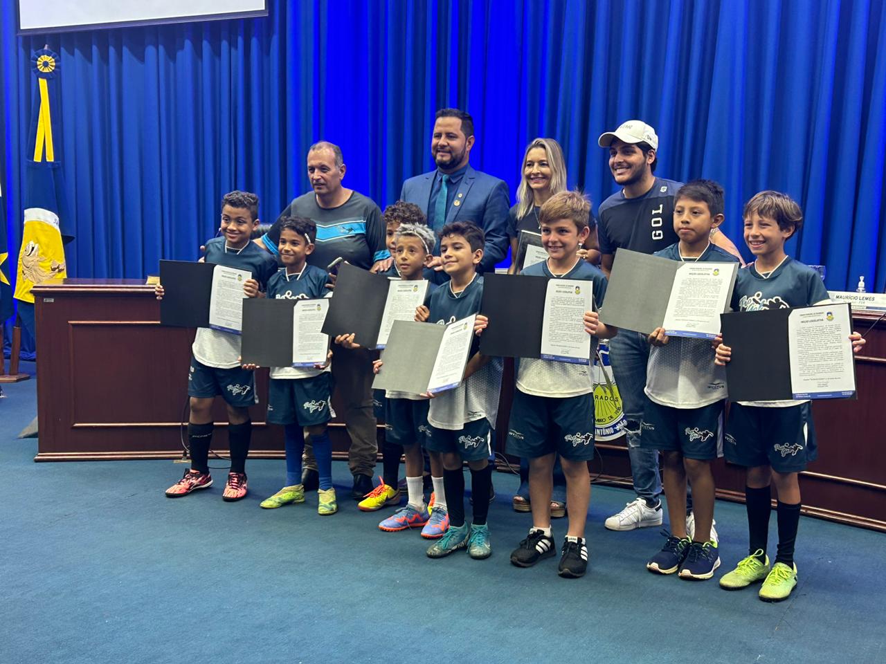 Durante a sessão ordinária de segunda-feira (27), o vereador Jânio prestou homenagem à delegação da Escola Pró-Gol pelas conquistas na 13ª edição da Copa Ecoturística Mercosul de Futebol, realizada no mês de janeiro, na cidade de Rancharia (SP). Cada atleta recebeu das mãos do vereador uma Moção de Aplausos.