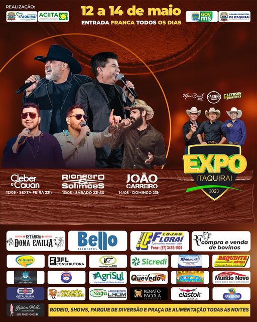 As festividades em comemoração aos 43 anos de Itaquiraí acontecerão nos dias 12, 13 e 14 de maio, no Pavilhão de Eventos. A abertura oficial acontece na noite de sexta-feira (12), a partir das 20h, com discurso de autoridades, praça de alimentação, exposição de produtos, parque de diversão, início do rodeio em touros com a narração de Marco Brasil e Fagner Rangel e às 23h grande show com Cleber e Cauan.