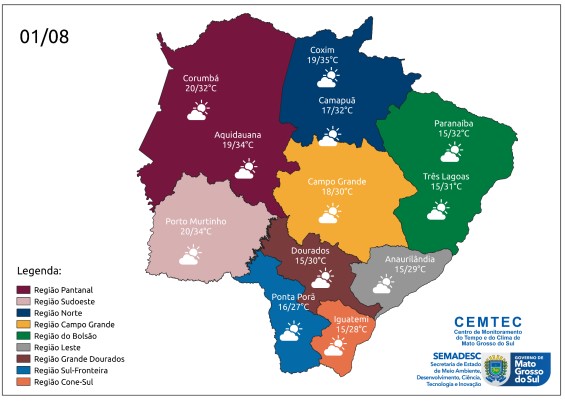 O Cemtec (Centro de Monitoramento do Tempo e do Clima) prevê mínima de 20°C em Corumbá e máxima de 32°C; Aquidauana terá variação entre 19°C e 34°C. Na região sudoeste, Porto Murtinho amanhece com 20°C e chega aos 34°C ao longo do dia. No norte, as mínimas ficam entre 17°C e 19°C, e as máximas atingem os 35°C. No Bolsão, Três Lagoas terá 15°C pela manhã e 31°C de tarde.