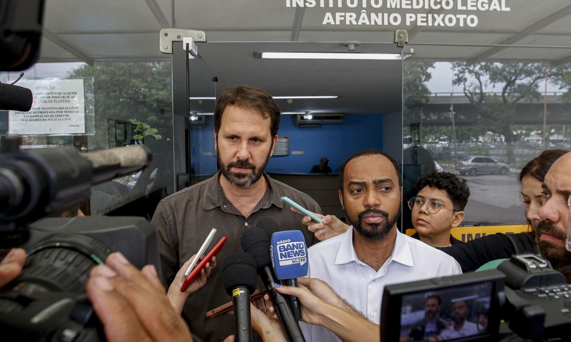 Rio de Janeiro (RJ) 05/10/2023 – Os deputados estaduais do PSOL Professor Josemar e Flávio Serafini falam no IML sobre o assassinato de três médicos em um quiosque na Barra da Tijuca. Foto: Fernando Frazão/Agência Brasil