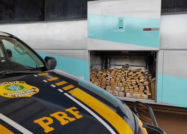Polícia Rodoviária Federal (PRF) apreendeu 554 Kg de maconha em um ônibus de viagem vindo do Paraguai, na manhã deste domingo (24), em Ponta Porã (MS).