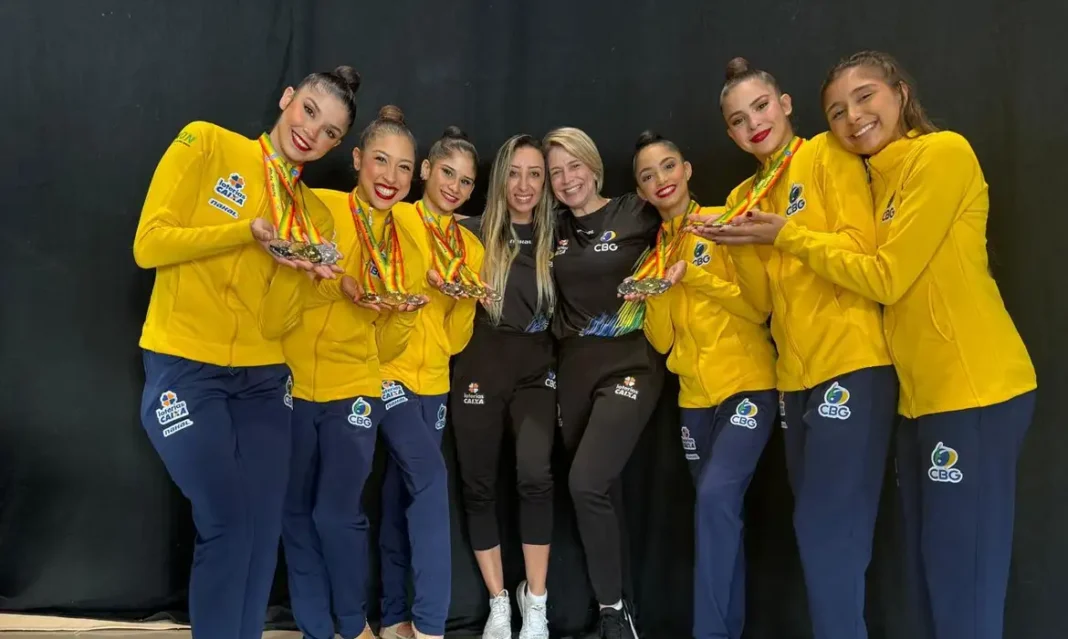 O conjunto brasileiro de ginástica rítmica arrematou o primeiro ouro da temporada e mais uma prata – a primeira fora obtida no sábado (11) – na etapa da Copa do Mundo, em Portimão (Portugal). Neste domingo (12), o time nacional (Deborah Medrado, Maria Eduarda Arakaki, Marianna Pinto, Nicole Pírcio, Sofia Madeira e Victória Borges) venceu a série mista ao somar 32,550 pontos. A prata ficou com o México (30.100) e o bronze com a Espanha (29.900).