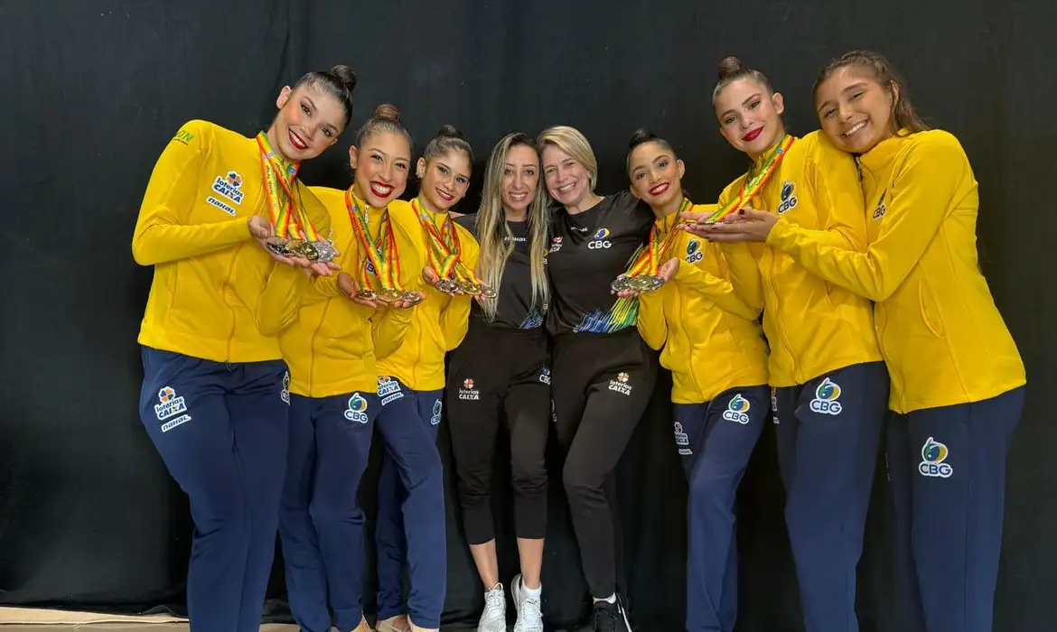As Leoas (apelido da equipe brasileira), com vaga assegurada nos Jogos de Paris, fizeram uma apresentação arrebatadora, ao som de ritmos brasileiros, usando fitas e bolas na coreografia.(Agência Brasil).