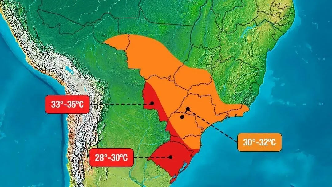 No Rio Grande do Sul, as temperaturas podem ficar entre 5°C e 8°C acima do comum para o mês, chegando a ficar entre 28°C e 30°C.