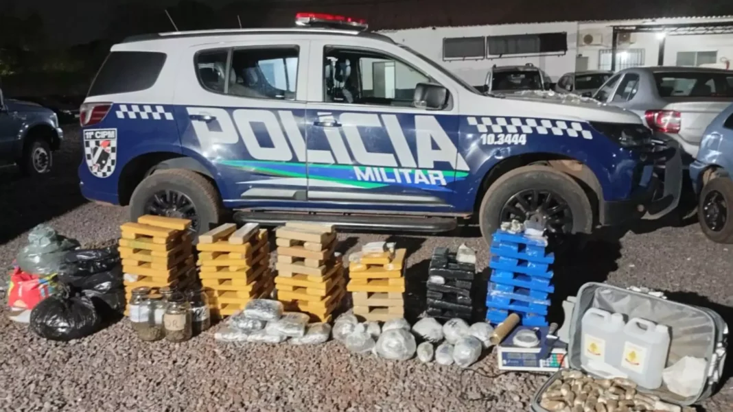 Além de uma marreta de borracha, uma peneira, um rolo de plástico filme, diversos sacos zip log vazios, dois galões de álcool hidratado, vários tipos de maconha que estavam em potes – o que indica que o local era utilizado para a produção de droga, embaladas e pesadas para a venda.