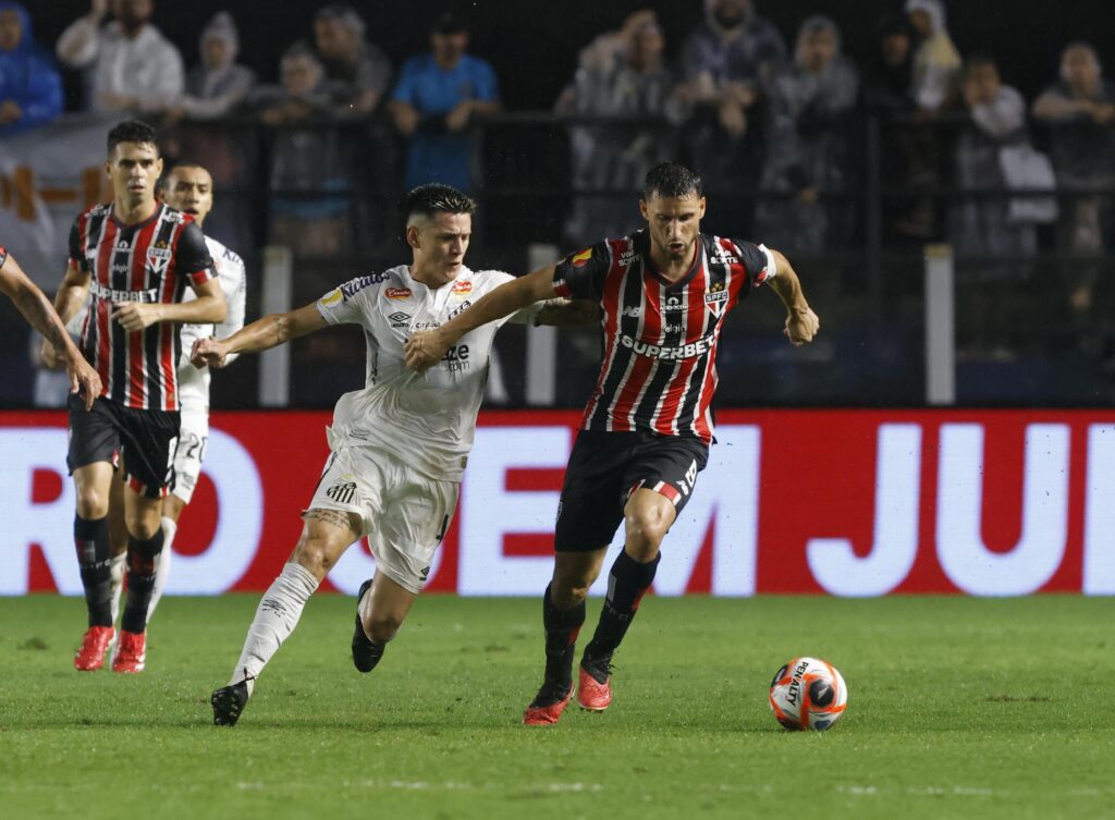Na etapa inicial da partida, sob uma chuva torrencial, Luciano e Calleri tabelaram e o camisa 9 finalizou, mas a bola saiu à esquerda do gol, aos 7 minutos. Aos 30, Alisson arriscou o chute de longe, sem sucesso. Aos 34, após boa jogada individual de Calleri, Lucas recebeu passe do argentino, girou e finalizou para abrir o placar para o Tricolor. Aos 41, o Santos empatou o jogo.