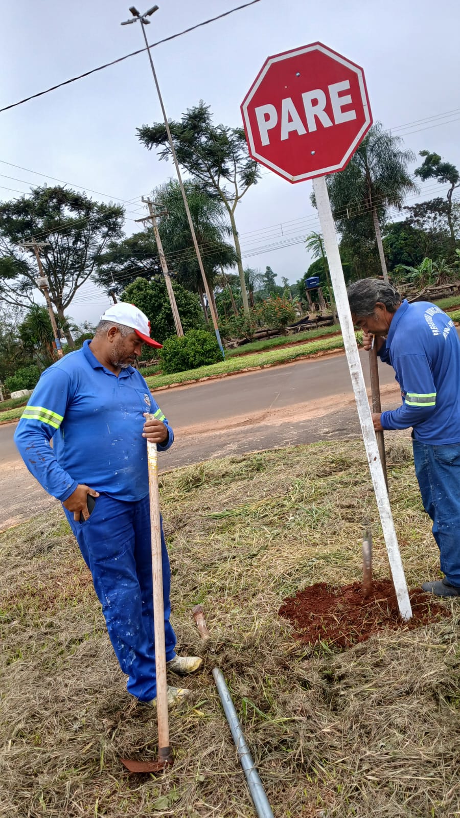 Servidores do Núcleo Municipal de Trânsito de Naviraí atuam na instalação de placas de regulamentação viária nos bairros Cidade Jardim e Cia Portal. ©Victor Dobbins/PMN