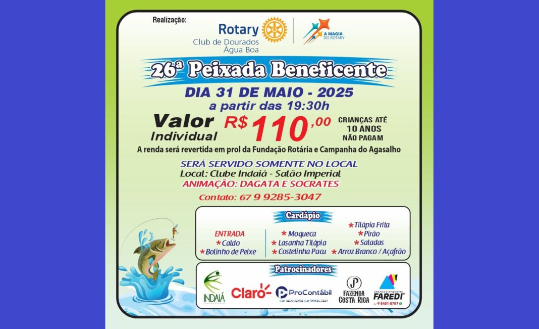 Acontece neste sábado (31 de maio) mais uma edição da tradicional Peixada Beneficente promovida pela Rotary Club Dourados Água Boa. Este evento é promovido há 26 anos.