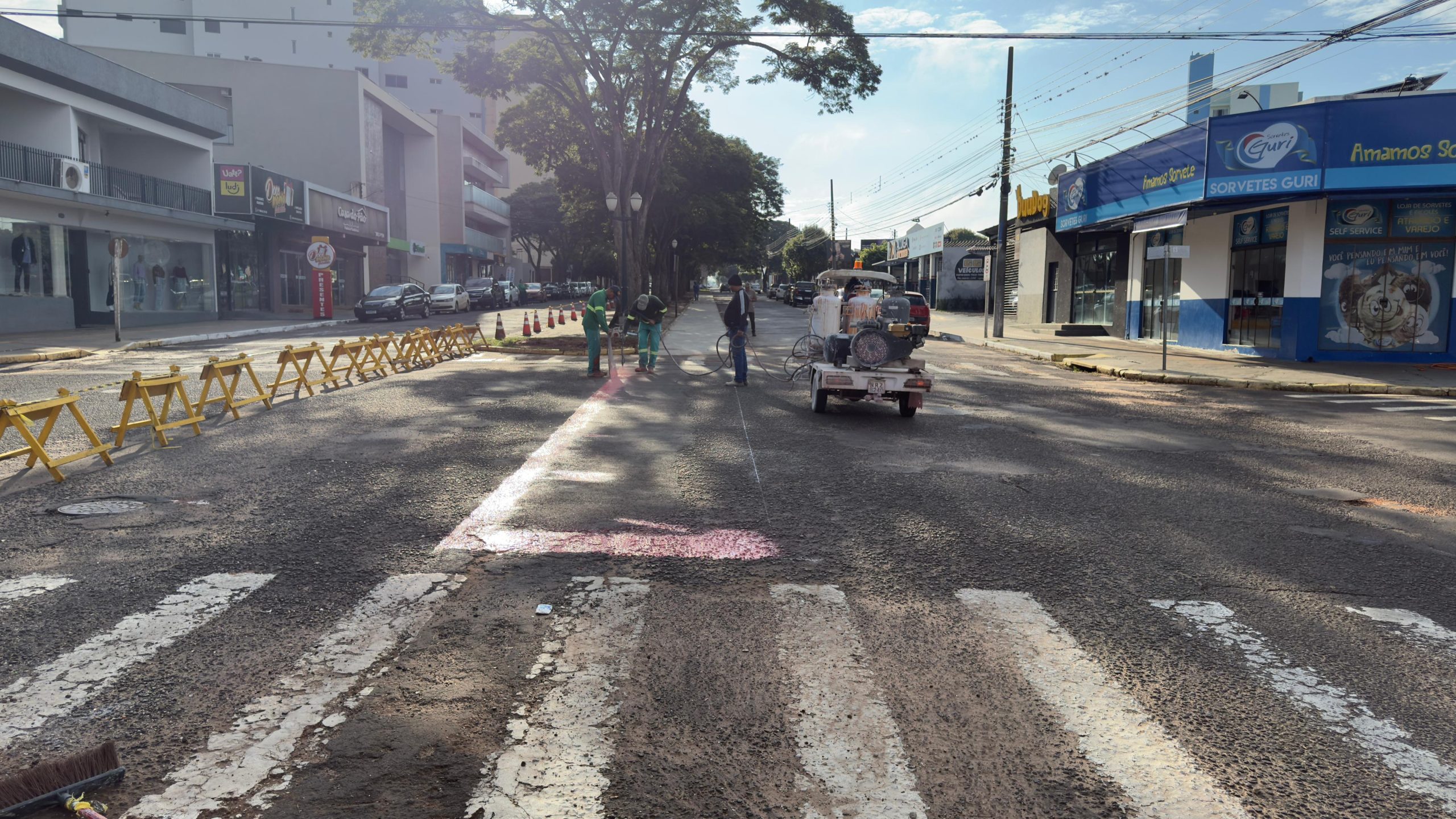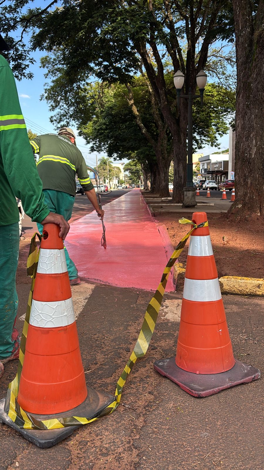 Após a interdição temporária do perímetro, os servidores do Município iniciaram a pintura da faixa de rolamento que demarca a ciclovia. Simultaneamente, após aplicação da base na cor vermelha, os profissionais estarão pintando as faixas tracejadas central amarela (mão dupla), marcações laterais, e as inscrições de regulamentação da ciclo faixa.