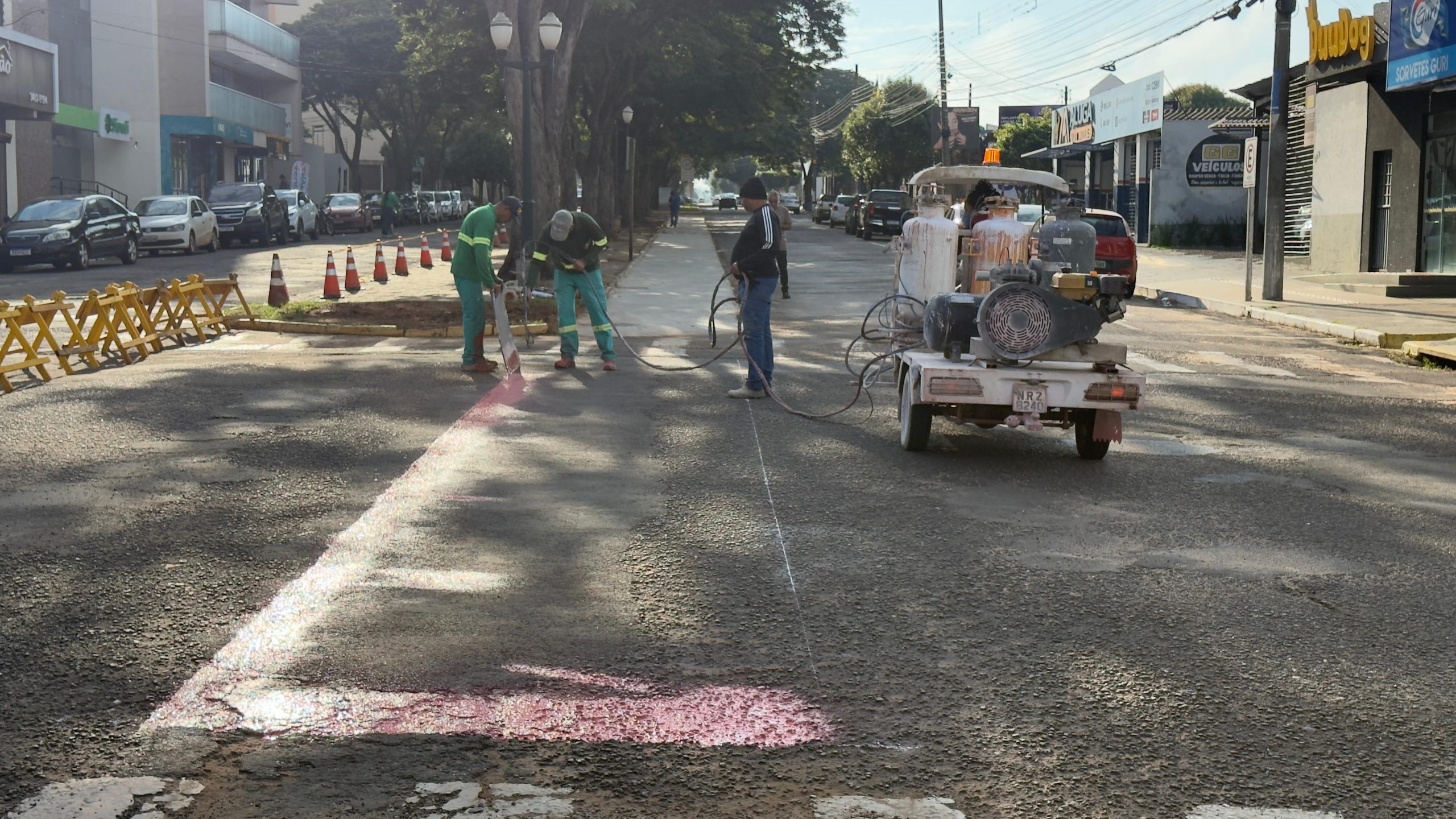 Equipe do setor de pinturas do Núcleo de Trânsito executam a pintura da nova ciclovia que está sendo implantada na Avenida Dourados. © Victor Dobbis/PMN