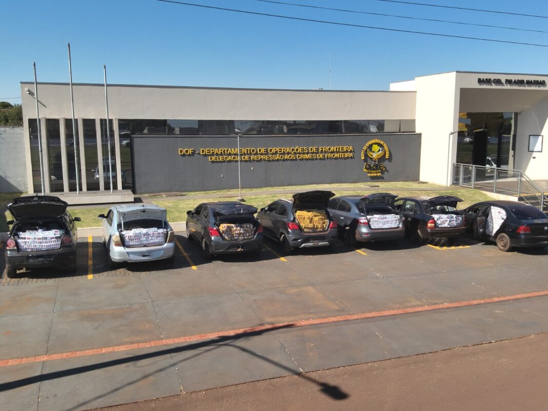 Sete veículos, sendo um furtado no Estado e outro com adulterações, foram interceptados com carga avaliada em mais de R$ 6 milhões. Apreensão aponta compartilhamento logístico entre traficantes e contrabandistas de cigarros