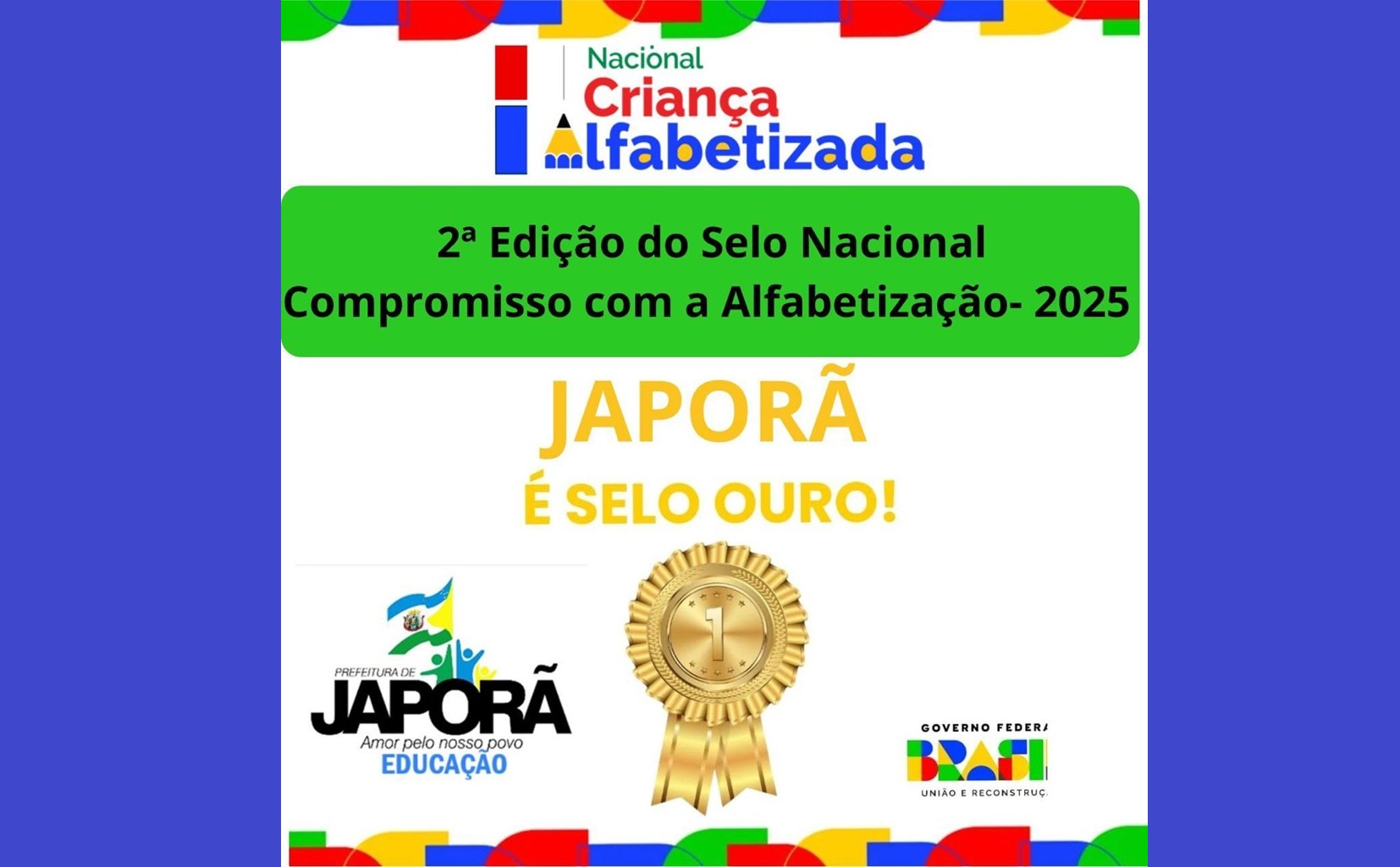 Pelo segundo ano consecutivo o município de Japorã atingiu a classificação máxima no Selo Nacional Compromisso com a Alfabetização. É “Selo Ouro na Educação”. Reconhecimento nacional concedido pelo Ministério da Educação (MEC) . A secretária municipal de Educação, Veridiana Barbosa da Silva confirmou a conquista, na tarde de ontem, segunda-feira (09-02).
