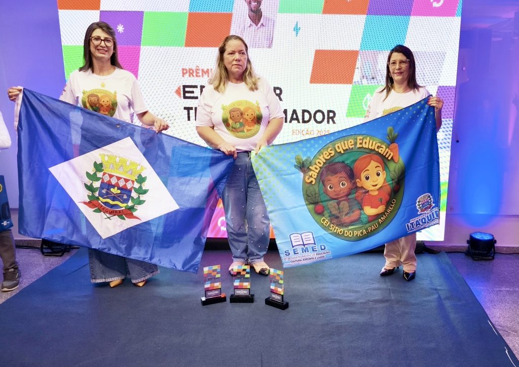 Representando o município, as professoras Vanessa Braghin e Traudi Moller, juntamente com a coordenadora Débora Freire, participaram da cerimônia com o projeto “Sabores que Educam”, desenvolvido por meio da Secretaria Municipal de Educação, Cultura, Esporte e Lazer.