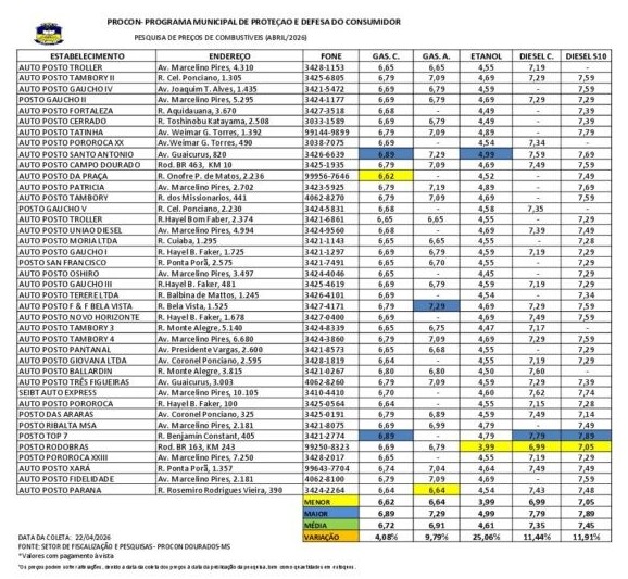 A Prefeitura de Dourados, por meio do Procon, divulgou nesta semana o resultado de mais uma pesquisa de preços de combustíveis realizada no município. O levantamento foi feito no dia 22 e abrangeu 40 estabelecimentos localizados na cidade e nos distritos.